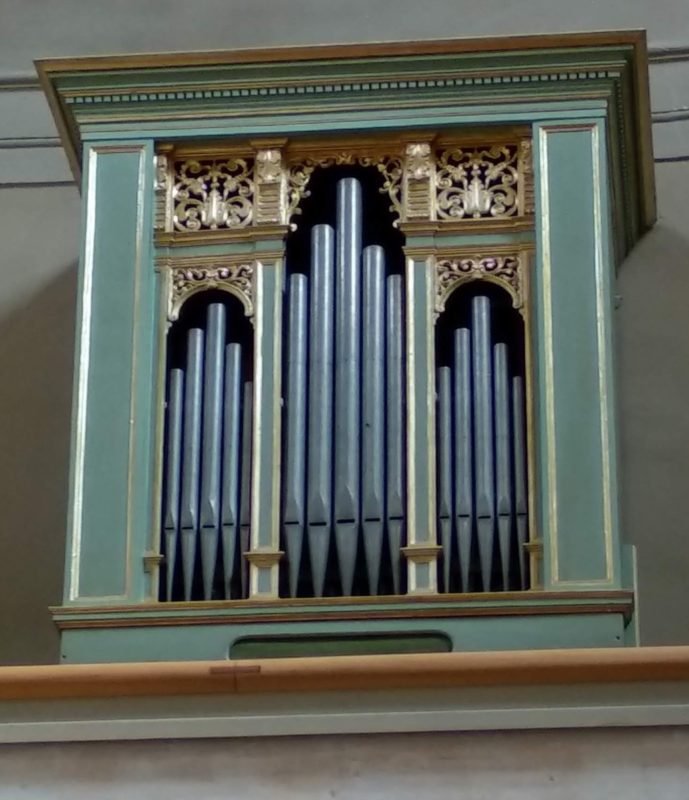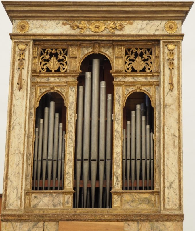 The façade consists of 19 tin pipes of the 8′ Principal I, divided into three flats of 7-5-7; the longest pipe in the middle flat corresponds to the note F18.
