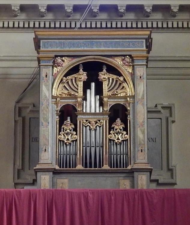 The low-pitched pipes of the first octave of the 8′ Principal I – Principal II and those of the 4′ Ottava – Flauto in VIII are in the rear case. The cypress pipes of the 8′ Principal II bass are arranged in the counter-façade.
