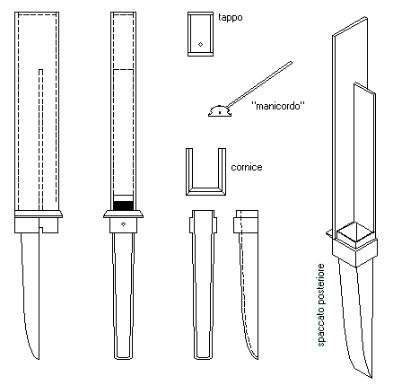 Il canaletto e la noce sono di bosso in un unico pezzo scavato: incollato a questo è il blocco anteriore della noce, nel quale è ricavata una tacca per l’inserimento di ancia e cuneo (di stagno), è forato frontalmente, per ospitare la chiavetta d’ottone che fissa la canna allo zoccolo in cui è inserita. Inoltre sia il blocchetto anteriore della noce che il coperchio della tuba sono forati per il passaggio del “manicordo” o accordatore. Il profilo del canaletto è a becco rastremato, a sezione quadrangolare (ha le stesse misure dei Tromboncini).