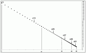 Come è stato illustrato nei due grafici nella pagina precedente, dopo aver liberata dal vincolo delle lunghezze la progressione delle larghezze di lastra, si può tracciare un grafico indipendente della “scala”, in cui le ascisse non mostrano più la lunghezza, ma semplicemente il numero sequenziale della nota.