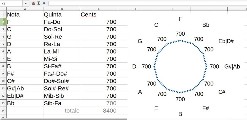 Nella terza colonna sono le ampiezze dell’intervallo di quinta misurate in cents (1 cent equivale a 1/1200 dell’ottava). Nell’ultima riga compare la somma totale delle 12 quinte, che dovranno disporsi sull’intera circonferenza. Nel sistema equabile tale somma è pari a 8400 cents, perché la pila delle 12 quinte si estende per sette ottave (1200×7). Se l’ottava deve essere pura e suddivisa in 12 note, allora una volta stabilite le 11 quinte ascendenti da Fa a Si♭, la dodicesima quinta rimasta, Si♭-Fa, è determinata automaticamente. Ecco perché il valore di questo intervallo è calcolato dal programma senza possibilità di modifica.