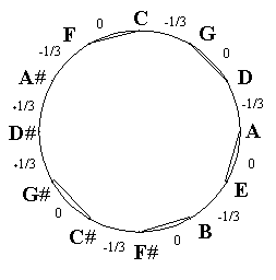 Nota Cents Quinta Scostamento C 0,000 C-G 694,135 -7,820 C# 82,406 C#-G# 701,955 0,000 D 196,090 D-A 694,135 -7,820 Eb 294,135 Eb-Bb 709,775 7,820 E 392,180 E-B 694,135 -7,820 F 498,045 F-C 701,955 0,000 F# 588,270 F#-C# 694,136 -7,819 G 694,135 G-D 701,955 0,000 G# 784,361 G#-D# 709,774 7,819 A 890,225 A-E 701,955 0,000 Bb 1003,910 Bb-F 694,135 -7,820 B 1086,315 B-F# 701,955 0,000 Terza magg. Scost. Terza min. Scost. C-E 392,180 5,866 C-Eb 294,135 -21,506 Db-F 415,639 29,325 C#-E 309,774 -5,867 D-F# 392,180 5,866 D-F 301,955 -13,686 Eb-G 400,000 13,686 D#-F# 294,135 -21,506 E-G# 392,181 5,867 E-G 301,955 -13,686 F-A 392,180 5,866 F-Ab 286,316 -29,325 F#-A# 415,640 29,326 F#-A 301,955 -13,686 G-B 392,180 5,866 G-Bb 309,775 -5,866 Ab-C 415,639 29,325 Ab-C 301,954 -13,687 A-C# 392,181 5,867 A-C 309,775 -5,866 Bb-D 392,180 5,866 Bb-Db 278,496 -37,145 B-D# 407,820 21,506 B-D# 309,775 -5,866
